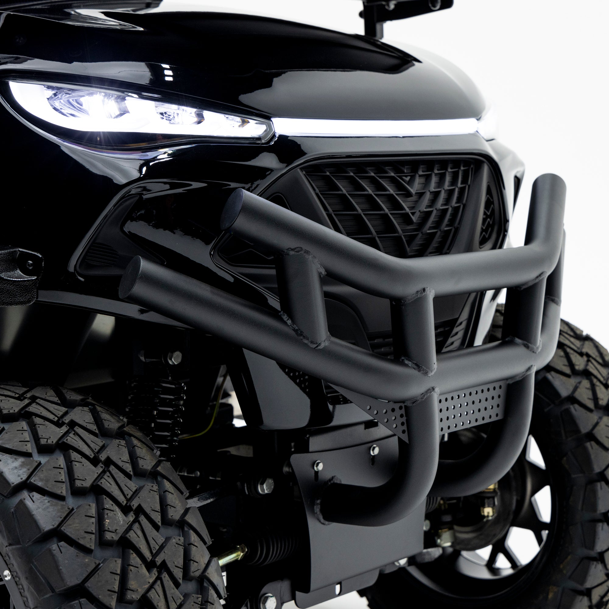 Our golf cart chassis feature a lightweight aluminum frame and dual A-arm independent suspension with a coil-over 6" lift, ensuring superior handling and stability. Equipped with 4-wheel disc brakes, black 14" aluminum wheels, and 23" all-terrain tires, this cart is built for exceptional performance on any terrain.