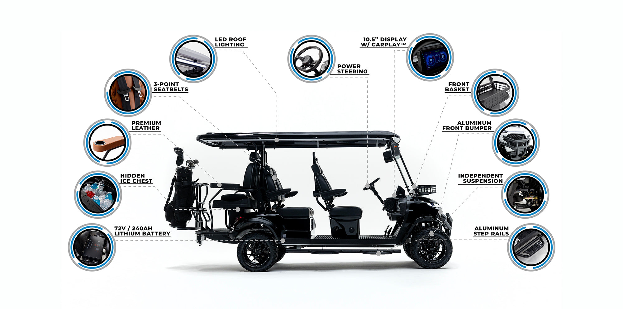 Bolt Series golf carts boast a powerful 7.5kw motor, 400amp controller and a 72v/240ah lithium battery, and a remarkable 96-mile drive range. With an 8-hour charge time, this cart ensures you have the power and endurance for all your adventures.